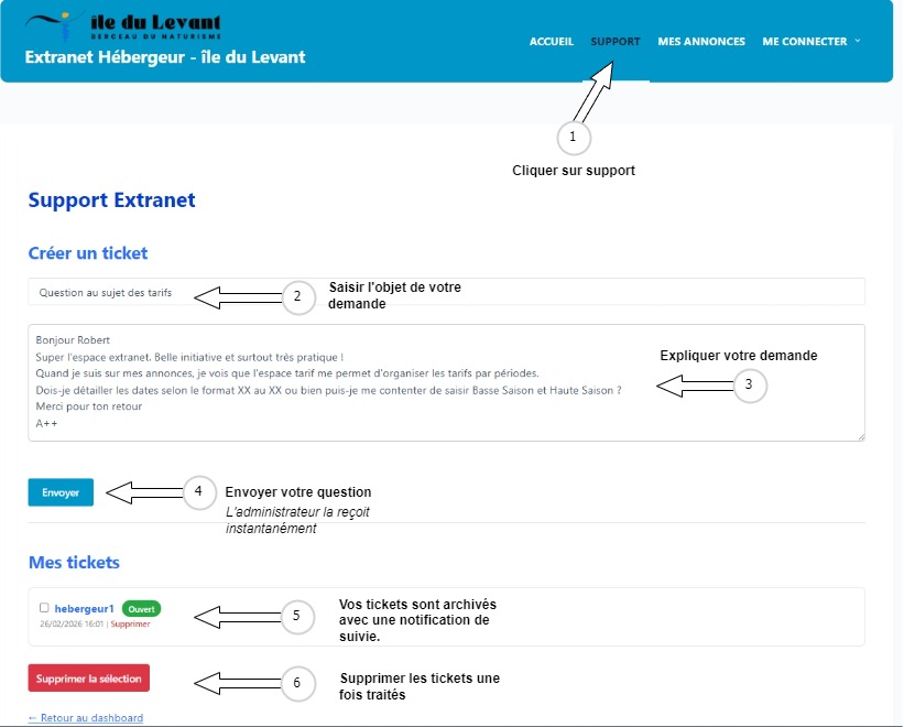 Une nouvel espace nommé « SUPPORT » permet d’entrer rapidement en contact avec l’administrateur du site. Cet espace centralise les échanges en un seul endroit et évite l’éparpillement des infos reçues par SMS, Whatsapp ou Email.